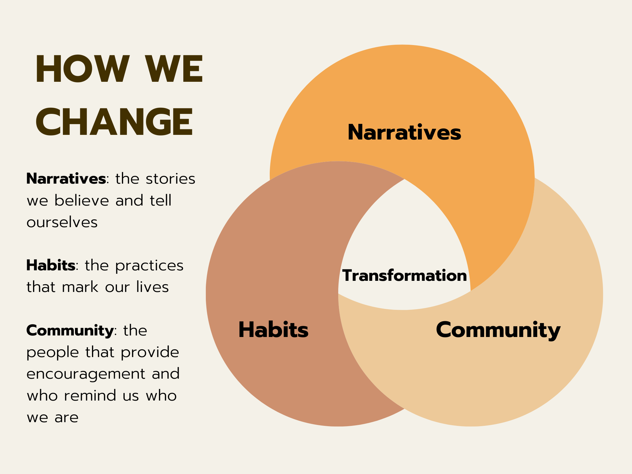 These three formational elements are not separate or distinct programs or pursuits but naturally overlap and fuel one another. Our narratives shape our habits and communities. Our habits strengthen our narratives and community. Community inspires narratives and habits. We believe significant transformation takes place when these three elements take place with integration and in unison.